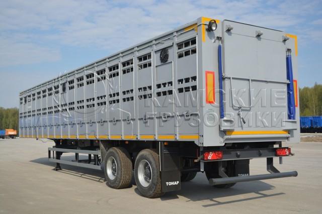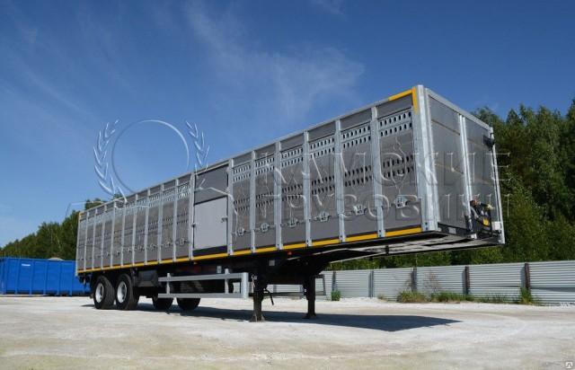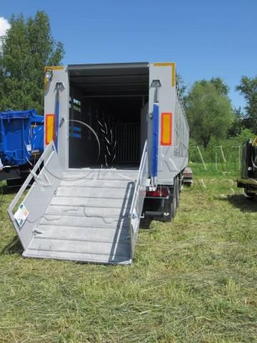 | Особенности комплектации автомобиля | Расчетная вместимость: крупный рогатый скот –до 26 голов -весом до 550 кг., до 33 голов - 450 кг.,до 54 голов - 220 кг. , свиньи –фактически – до 80 голов. Грузоподъемность – 22 000 кг., собственный вес – 8 000 кг., длина 13,6 м. Шасси – двухосное, односкатное, пневмоподвеска, ЕBS «Нaldex», «Wabco» Кузов – собран из металлических оцинкованных стоек с поперечинами на крыше. Снаружи облицован алюминиевыми листами, два ряда вентиляционных окон на боковых стенках, закрываемых металлическими заслонками (новая усиленная конструкция). На крыше – ламинированная фанера 9 мм, покрытая листом алюминия. Задний проем: откидной дверь-трап, со складными бортиками, позволяет легко производить погрузку-выгрузку. Внутри – три перегородки. Пол – рифленый металлический лист с тремя продольными профилями от проскальзывания копыт, покрытие – герметичное полимерное покрытие. Дополнительно устанавливаемое оборудование – поилки (для свиней или для КРС – 6шт), вентиляторы, освещение трапа и кузова (2 прожектора). Боковая аварийная дверь-трап. Высота ССУ – 1200 мм. |